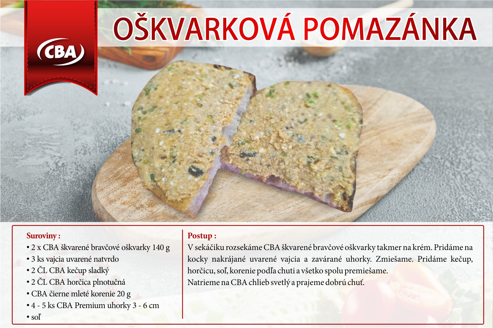 Máte chuť na poctivú desiatu alebo pohostenie pre návštevu? Naša oškvarková pomazánka je stávka na istotu. Je krémová, sýta a všetky potrebné suroviny nájdete priamo v našich predajniach Karmen – CBA Potraviny. 🛒