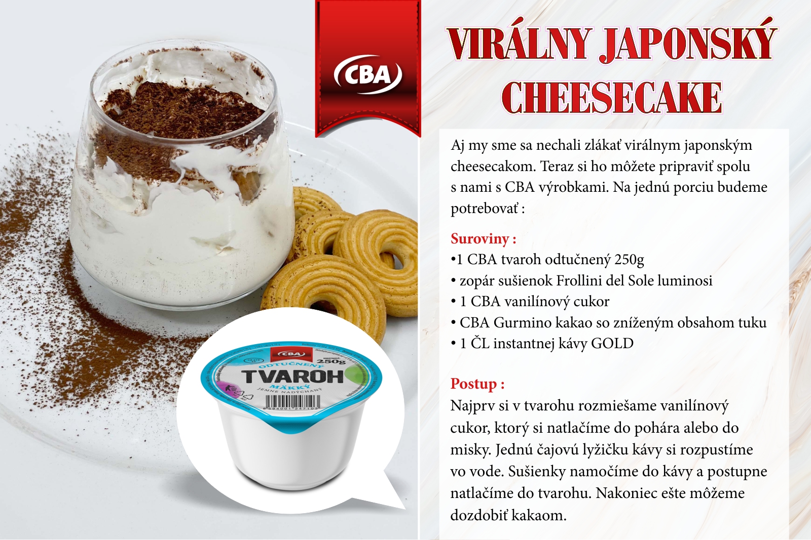 Tentokrát sme sa nechali zlákať populárnym japonským cheesecakom, ktorý sme si však upravili do rýchlej a praktickej „pohárovej“ verzie. S našimi CBA výrobkami ho vyčarujete za pár minút a výsledok je neskutočne jemný a nadýchaný.